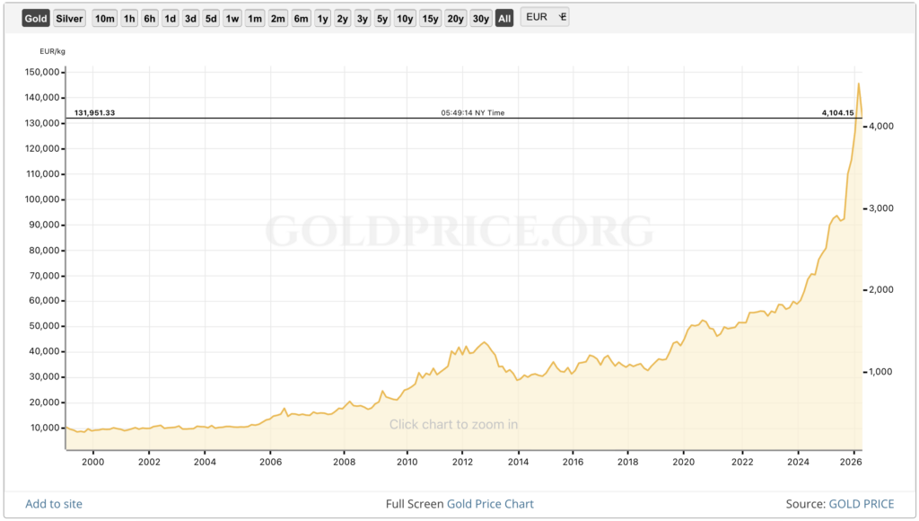 I did a calculation based on the prices of gold. 1 DEM (German Mark) = 7.182 EUR. People have it in the back of their minds that 1 EUR = 2 DEM, but that was then, and this is now. One EUR from 2000 would buy more than 14 EUR today.